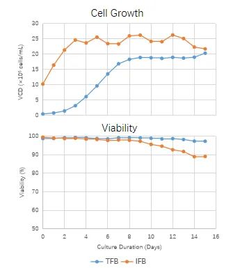 加强型补料培养(IFB)和常规补料培养(TFB)细胞生长及活率对比